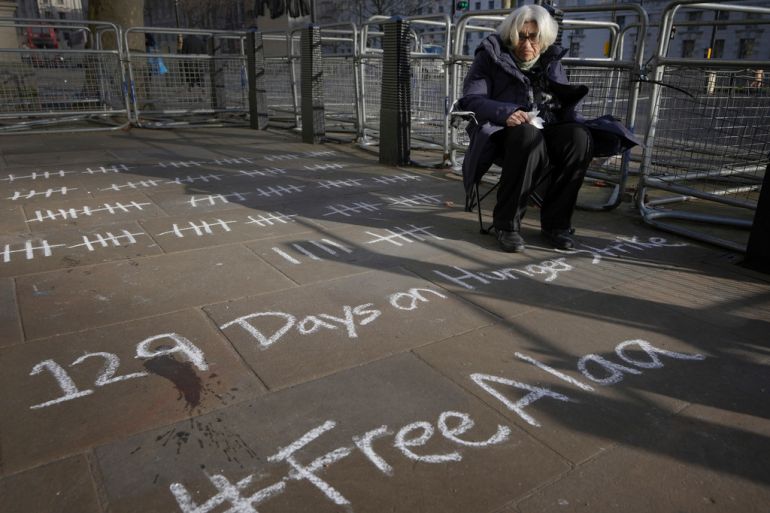 Laila Soueif seeks the release of her son Alaa Abd El-Fattah from prison in Egypt as she sits outside Downing Street in London on February 5, 2025 [Kirsty Wigglesworth/AP Photo]